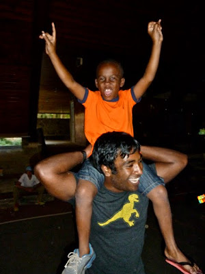 Not Ian, he hits the thing with some speed and blazed the downhill. I could tell by the look on his face the speed took him by surprise. He holds it together and coasts pretty far up the other side - nearby to me. Even with me yelling "Pedal, pedal, pedal", he freezes and coasts to a stop - where I grab him. He's laughing and saying he forgot to pedal - was a little scared. I tell him he could have made it - great job - wanna try it again? Huh, yeah - but not today.